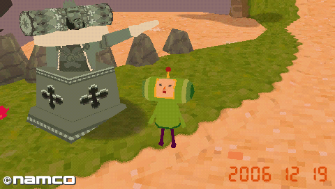 というのがエンディングの一部始終です。相変わらずストーリーもへったくれもないですね。まるで昔のゲームのようである。ほれ、ファミコンのマリオだってピーチ姫に会ったらそこで即2週目が始まっちゃうでしょ。スペランカーだってお宝見つけたらまた2週目が始まるでしょ。この「塊魂」シリーズも一度クリアしたとしても当然のようにゲームが続いてしまうという点では同じである。ノスタルジック!(そうか?)。とはいえ一応クリア特典として王様が王子の写真を撮ってくれるモードが追加になりました。王子が持っているカメラでは撮影できないオウジ島・ミニ火山島・豆の木島でも写真撮影ができるようになったよ。さっそく撮影させろと王様が言うので1枚撮ってもらった。パシャリ。